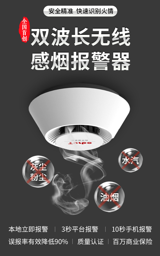 JTY-GD-TCN2010 雙波長無線感煙報警器是采用一體式結(jié)構(gòu)設(shè)計的無線感煙報警器,基于NB-IoT無線標(biāo)準(zhǔn),具備遠(yuǎn)距離無線通信能力。為了降低誤報率,在不影響火災(zāi)報警檢測靈敏度的基礎(chǔ)上,采用最先進(jìn)的雙波長檢測手段,能夠有效防止水霧、油霧以及大顆粒粉塵導(dǎo)致的誤報現(xiàn)象。當(dāng)發(fā)生火災(zāi)時,報警器能探測煙霧,支持聲光報警,提示現(xiàn)場人員進(jìn)行滅火處理或逃生。報警器可以檢測電池低電量、光電 發(fā)射故障、無線通訊故障等,支持聲光報警器提示。同時,可以將火災(zāi)報警信息、設(shè)備故障信息等通過無線方式實時地上報到遠(yuǎn)端消防平臺,方便遠(yuǎn)程監(jiān)控火情和維護(hù)設(shè)備。